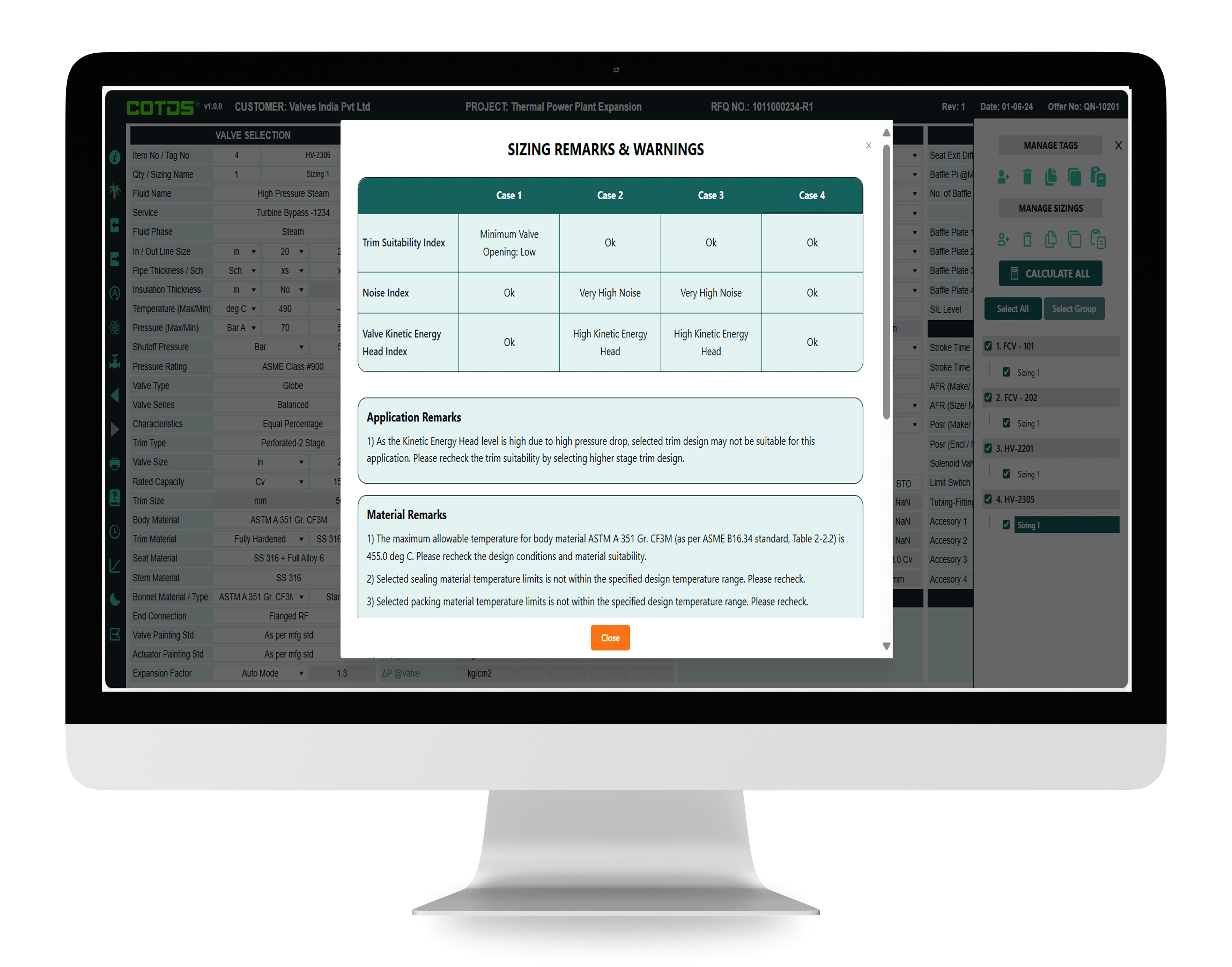 Leveraging three decades of combined expertise in control valve application engineering, design, and valve quotation processes, co-founders have meticulously crafted the COTDS control valve sizing & selection software. Cotds sizing software incorporates a wealth of check points, sizing remarks & warnings, trim suitability criteria and efficient features. These elements collectively empower users to navigate through the control valve selection process with confidence, ensuring that each step leads to a precise and optimal selection.